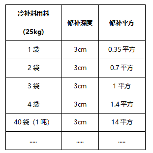 (計算公式:坑槽表面積(平方)*坑槽深度(米)*2.37(密度)=瀝青冷補料用量(噸))以一袋冷補料25kg,修補深度3cm為例,一袋預計可鋪0.35平方;以此類推: